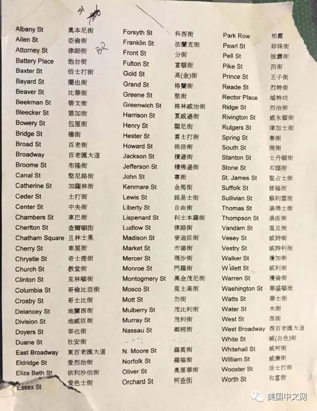 从这张马越主任带来的对照表上不难看出,街道中文名大多是英文街道名的广东话译音。比如Mott Street的中文名是勿街,广东话的“勿”发音就是mo;也有一个街道有多种中文叫法的,比如Worth Street既可以叫“窝扶街”,也可以叫“和富街”,相比之下,“和富街”是添加了一些中文意义里的美好愿望,但发音基本不变。还有个别街道是英文的中文翻译,比如Church Street“教堂街”。另外,有些街道不仅有中文名,还有中文昵称,比如Mulberry Street的中文名是茂比利街,但也常常被叫做意大利街;East Broadway除了被叫做东百老汇,还被称作福州街;Division Street是地威臣街,也被叫做卖帽街;Eldridge Street叫作爱烈治街,昵称也叫鱼丸街......这些昵称都体现了这些街道的特色。