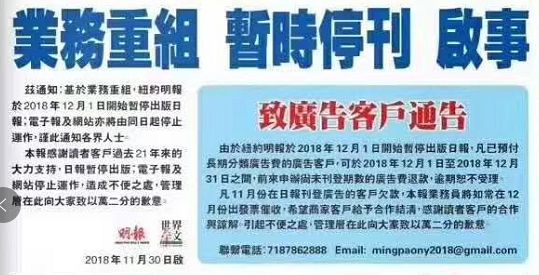“业务重组暂时停刊”的启事刊登在11月30日的头版上,内容要点:“基于业务重组,纽约明报于2018年12月1日开始暂停出版日报;电子报及网站亦将由同日起停止运作”;并附有致广告客户通告,说明了广告费退款和催收的相关事宜。